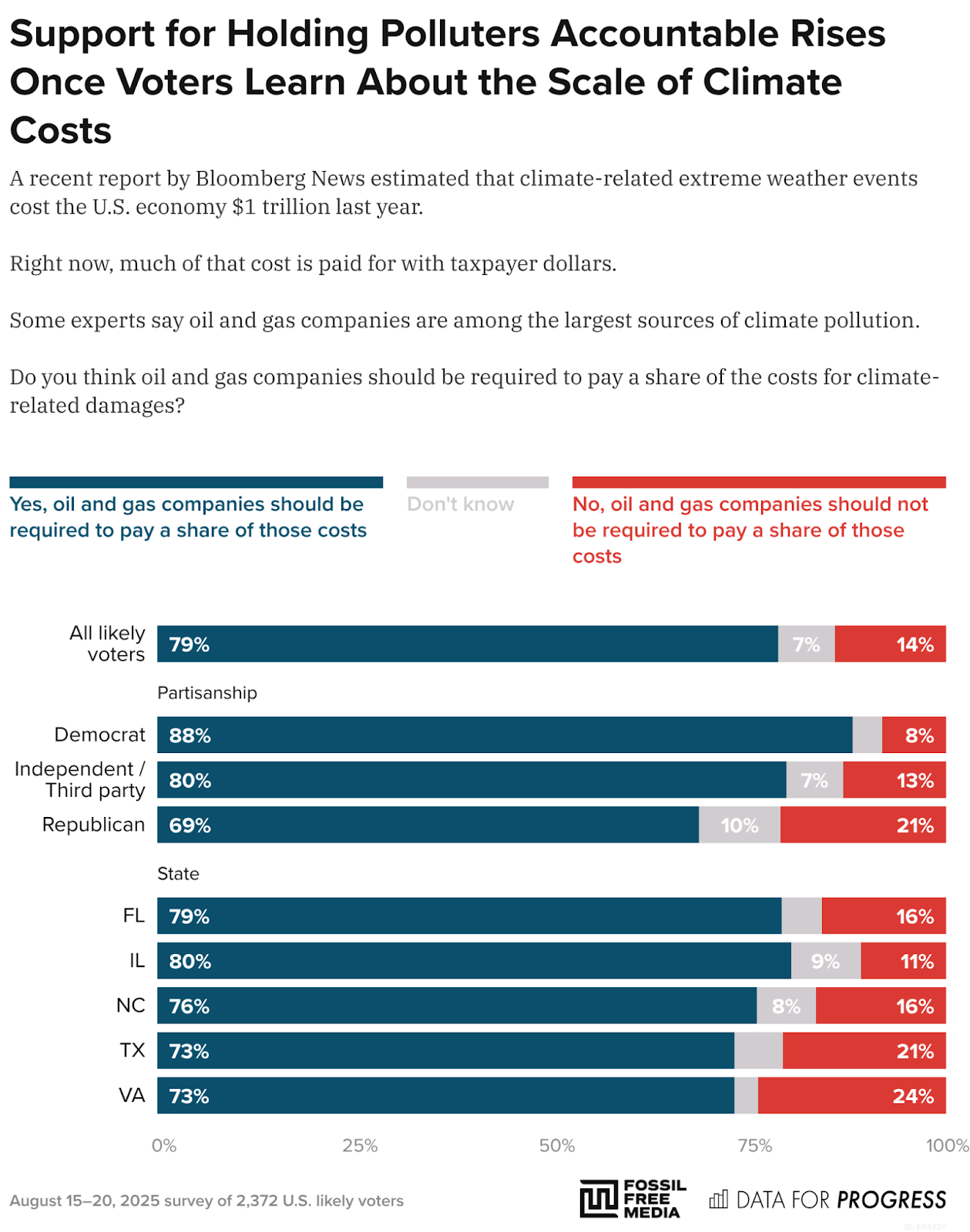 When informed that climate-related extreme weather cost the U.S. economy $1 trillion last year (primarily shouldered by taxpayers), support for holding polluters accountable grows to 79% overall, including 69% of Republicans.