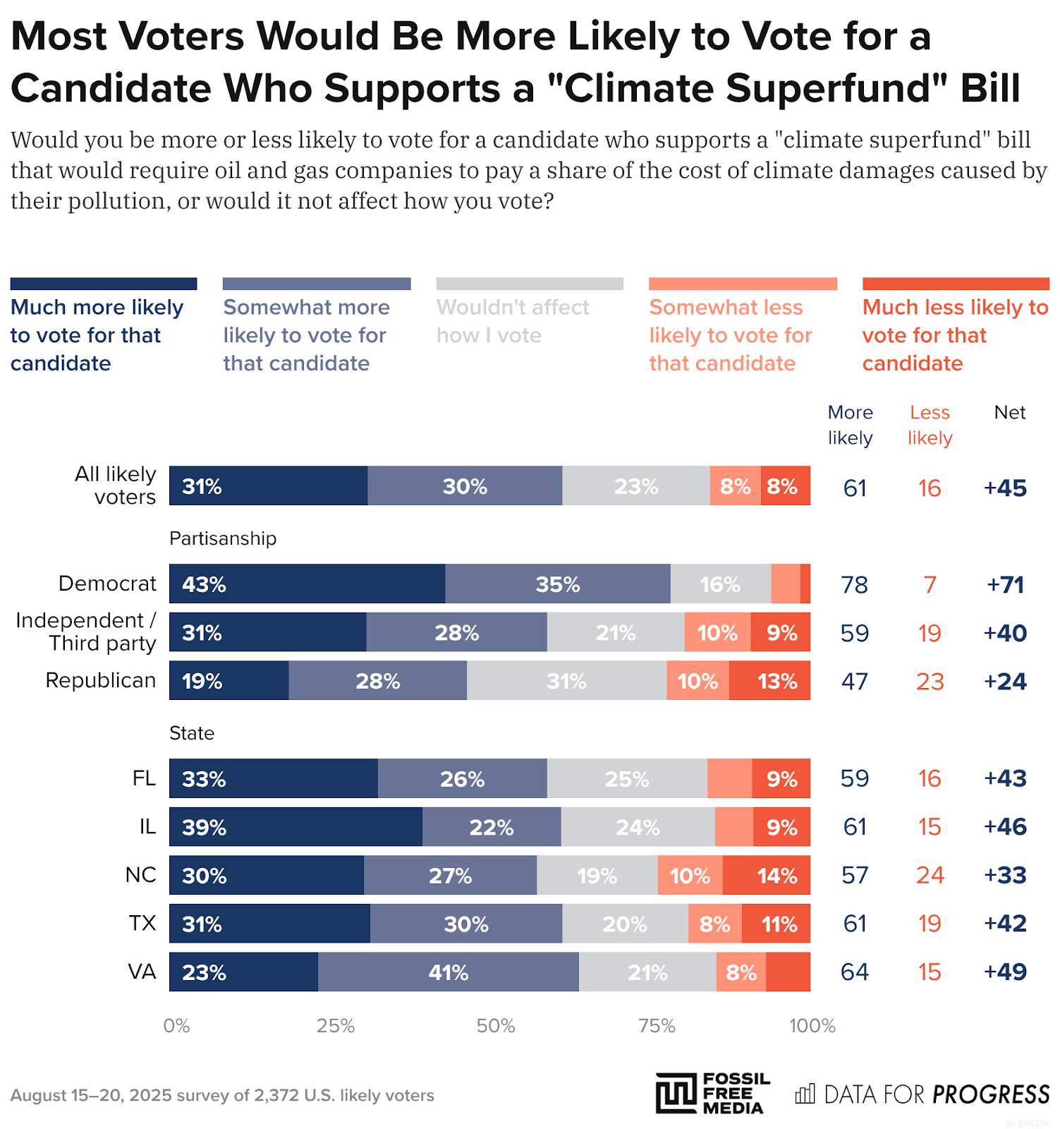 More are likely to support candidates who back these measures. This support has grown since earlier polling and crosses partisan lines, with majorities of Republicans backing polluter accountability.